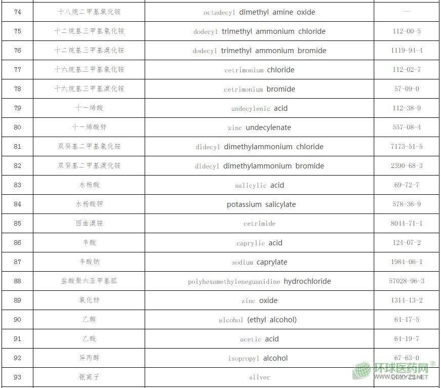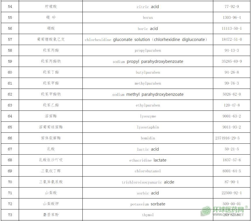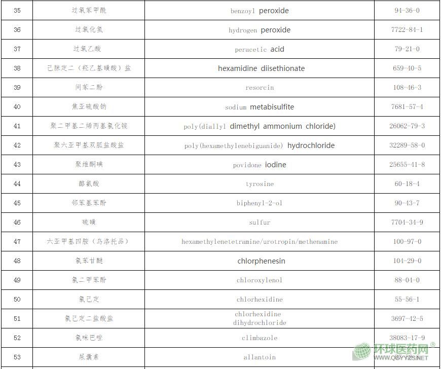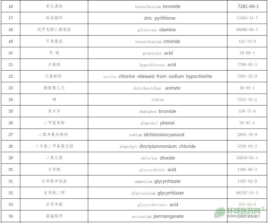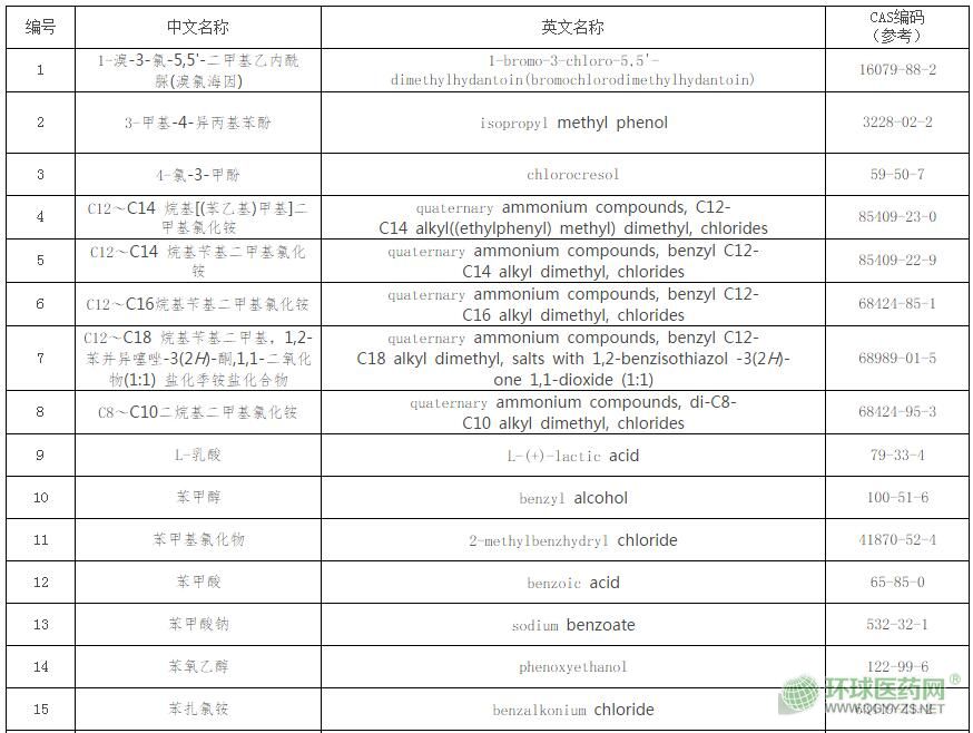 (二)納入原則。中國藥典二部(2015年版)中的消毒防腐類和四部(2015年版)中的抑菌劑類全部納入,國家標(biāo)準(zhǔn)《消毒劑原料清單及禁限用物質(zhì)》(報批稿)中用于人體皮膚黏膜的消毒劑有效成分全部納入,美國FDA的OTC藥品專論、歐盟ECHA審批的人體用生物殺菌劑有效成分清單、歐盟抗抑菌洗手液有效成分清單和日本厚生勞動省發(fā)布的醫(yī)藥部外品有效成分清單中規(guī)定的可用于抗(抑)菌劑的有效成分全部納入,但刪除上述7個來源中不符合抗(抑)菌劑有效性和安全性或不是單一有效成分的物質(zhì)。