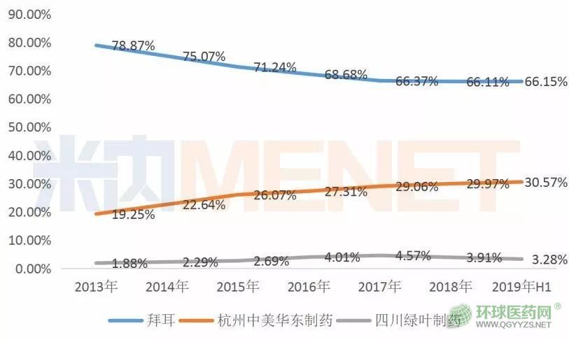 受到國內(nèi)仿制藥的沖擊,原研拜耳的市場份額一路下滑,2019上半年在重點(diǎn)省市公立醫(yī)院終端占比為66.15%,中美華東一路飆漲,從2013年的不到20%上漲至2019上半年的30.57%。