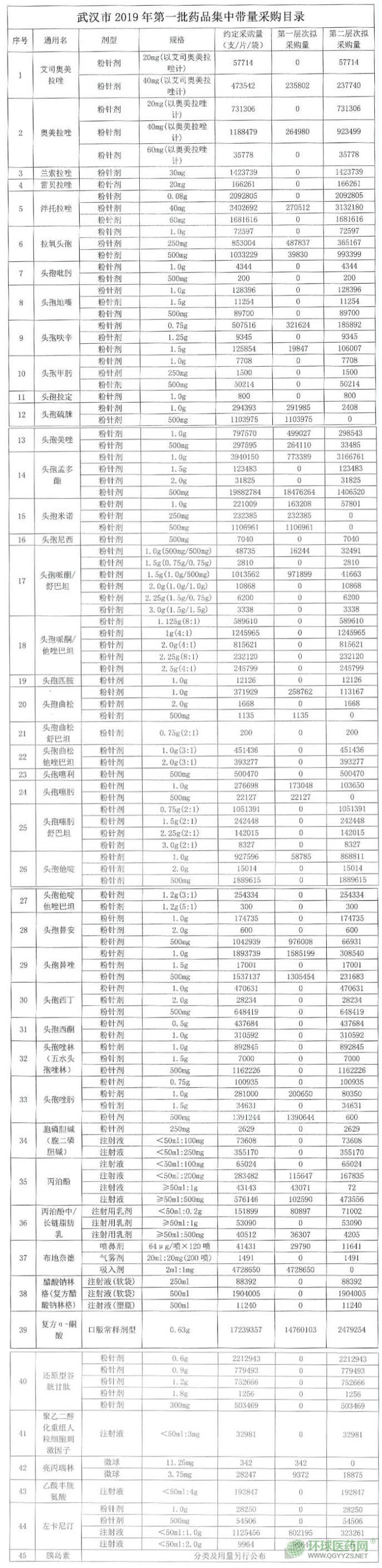 12月9日,武漢市藥械聯(lián)合采購辦公室發(fā)布《武漢市2019年第一批藥品集中帶量采購實(shí)施細(xì)則》和《武漢市2019年第一批藥品集中帶量采購目錄》,45個(gè)藥放量進(jìn)入第一批采購目錄。