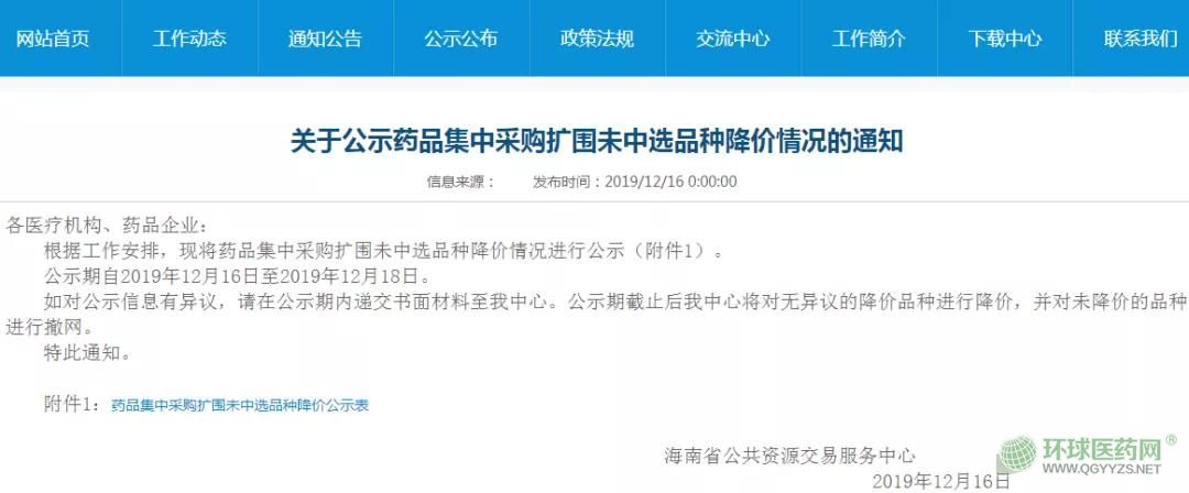 12月16日,海南省公共資源交易服務(wù)中心官網(wǎng)掛出《關(guān)于公示藥品集中采購擴(kuò)圍未中選品種降價情況的通知》,公示期截止后將對無異議的降價品種進(jìn)行降價,并對未降價的品種進(jìn)行撤網(wǎng)。