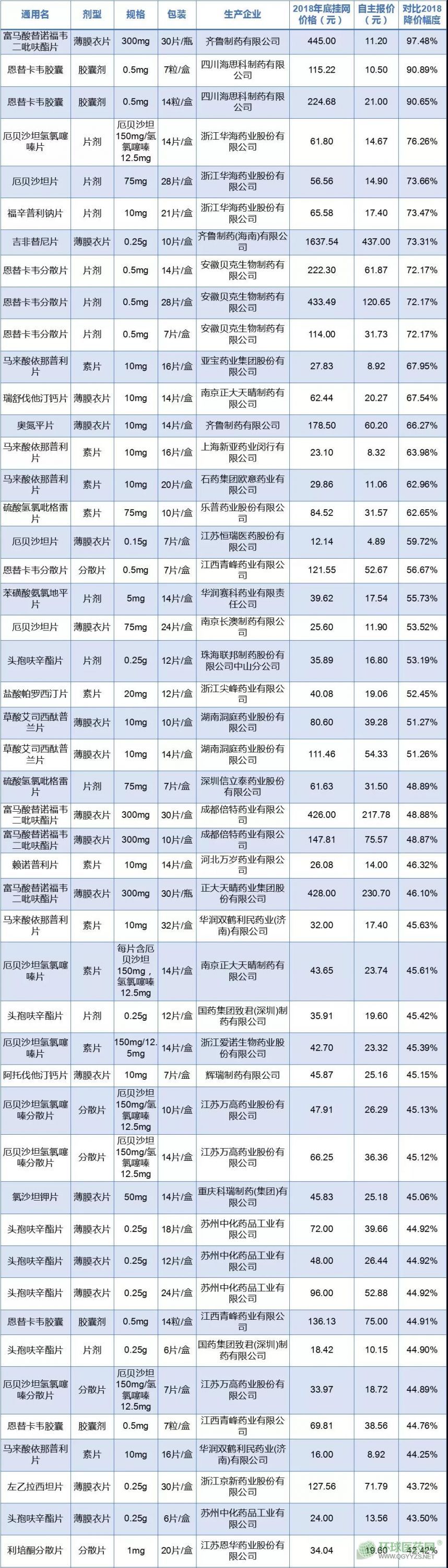 經(jīng)梳理,在235個需梯度降價的品規(guī)中,有149個選擇了降價,對比2018年底掛網(wǎng)價格降幅在50%以上的有24個,平均降幅為33.72%。其中,降價幅度最大的當(dāng)屬齊魯制藥富馬酸替諾福韋二吡呋酯片(300mg,30片/瓶)——較該產(chǎn)品2018年底掛網(wǎng)價下降97.48%,低于“4+7”擴(kuò)圍的中標(biāo)價。