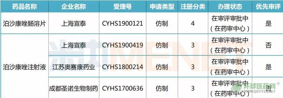 上海宣泰的泊沙康唑腸溶片已于2019年8月21日獲得FDA的ANDA,在美國上市銷售,并且于2019年2月19日在國內(nèi)報產(chǎn),2019年9月16日進入優(yōu)先審評名單,是國內(nèi)獨家完成生物等效性實驗,首家申報生產(chǎn)的泊沙康唑腸溶片,預計2020年能夠順利上市。