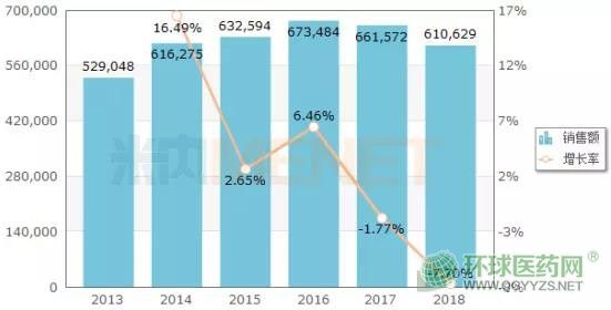 目前國(guó)內(nèi)市場(chǎng)上市銷售的鹽酸氨溴索注射劑有鹽酸氨溴索注射液、注射用鹽酸氨溴索、鹽酸氨溴索葡萄糖注射液及鹽酸氨溴索氯化鈉注射液,在2018年中國(guó)公立醫(yī)療機(jī)構(gòu)終端合計(jì)銷售額為61.06億元,其中鹽酸氨溴索注射液占據(jù)58.9%的市場(chǎng)份額。