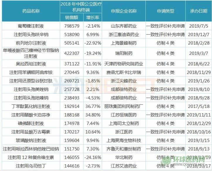 日前,正大天晴的注射用鹽酸苯達(dá)莫司汀與四川美大康華康藥業(yè)的鹽酸氨溴索注射液接連獲批上市,視同通過(guò)一致性評(píng)價(jià)。米內(nèi)網(wǎng)數(shù)據(jù)顯示,目前16個(gè)注射劑已有企業(yè)通過(guò)或視同通過(guò)一致性評(píng)價(jià),CDE承辦受理的一致性評(píng)價(jià)補(bǔ)充申請(qǐng)及按新注冊(cè)分類申報(bào)上市的注射劑中,有70個(gè)品種僅1家企業(yè)申報(bào)且在2018年中國(guó)城市公立醫(yī)院、縣級(jí)公立醫(yī)院、城市社區(qū)中心以及鄉(xiāng)鎮(zhèn)衛(wèi)生院(簡(jiǎn)稱中國(guó)公立醫(yī)療機(jī)構(gòu))終端的銷售額超過(guò)1億元。