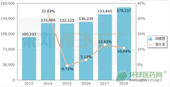 米內(nèi)網(wǎng)數(shù)據(jù)顯示,2018年中國城市公立醫(yī)院、縣級公立醫(yī)院、城市社區(qū)中心以及鄉(xiāng)鎮(zhèn)衛(wèi)生院(簡稱中國公立醫(yī)療機(jī)構(gòu))終端注射用鹽酸萬古霉素銷售額為17.02億元,同比增長10.64%。