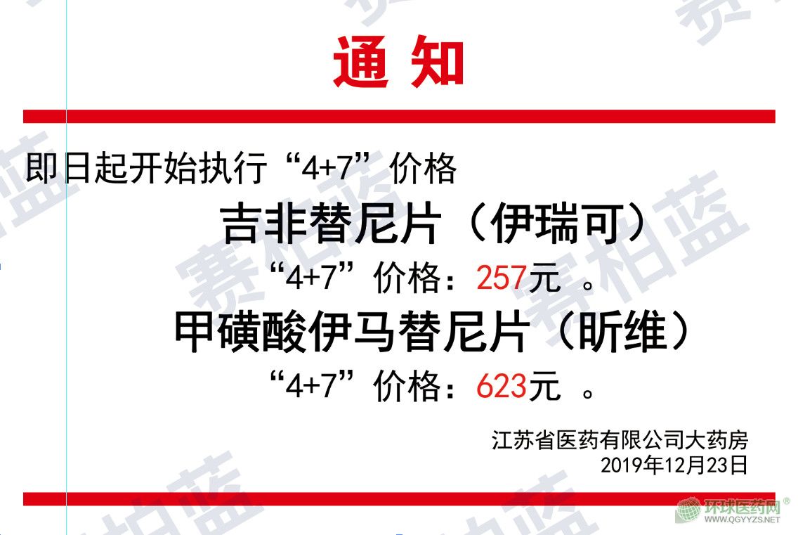 賽柏藍獨家獲悉,江蘇省醫(yī)藥公司大藥房在12月23日發(fā)布公告稱,即日起開始執(zhí)行4+7價格,吉非替尼片(伊瑞可)價格調(diào)整為257元,甲磺酸伊馬替尼片(昕維)價格調(diào)整為623元。