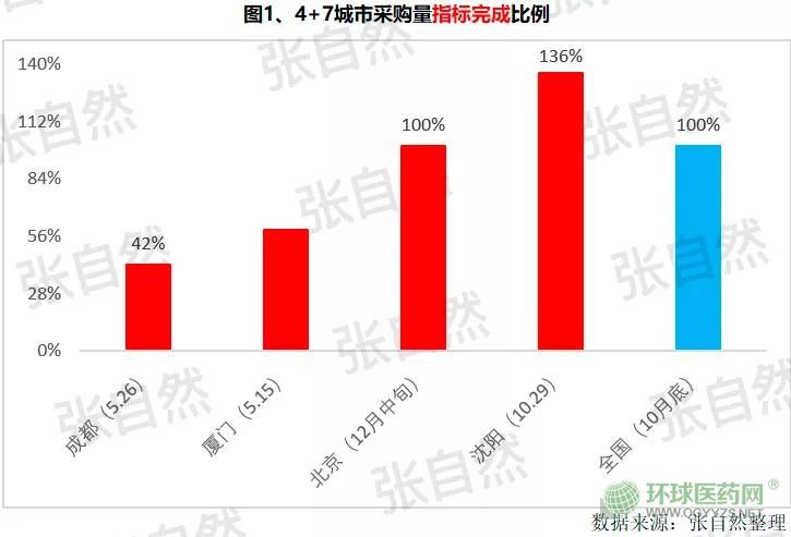 從2019年3月18日廈門中山醫(yī)院開出第一張4+7中選品種處方開始,到4月1日,11個試點城市已全部開始采購使用,僅一個半月多一點的時間(5月15日),廈門就完成了全年指標(biāo)的59%,到10月29號沈陽已完成了156%,到10月底,全國已提前完成全年指標(biāo),超出了預(yù)期。