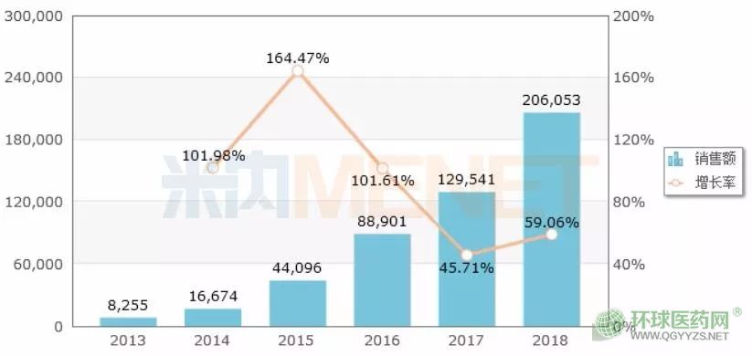 米內(nèi)網(wǎng)數(shù)據(jù)顯示,2018年在中國城市公立醫(yī)院、縣級公立醫(yī)院、城市社區(qū)中心及鄉(xiāng)鎮(zhèn)衛(wèi)生院(簡稱中國公立醫(yī)療機構(gòu))終端注射用替加環(huán)素的銷售額已經(jīng)超過了20億元,增長率為59.06%。