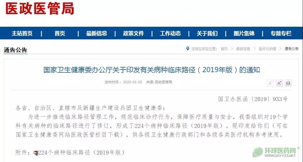 國家衛(wèi)健委醫(yī)政醫(yī)管局發(fā)布《關于印發(fā)有關病種臨床路徑(2019年版)的通知》。