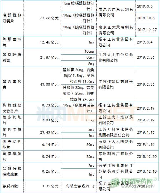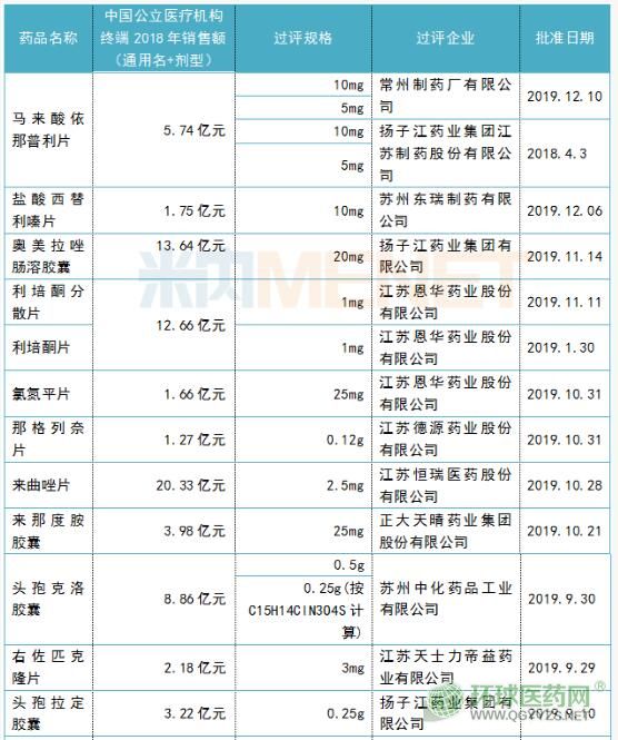近日,江蘇省藥監(jiān)局發(fā)布了該省已通過仿制藥質(zhì)量和療效一致性評(píng)價(jià)品種清單。截至2019年12月31日,共有46個(gè)品種,63個(gè)品規(guī)過評(píng),其中,揚(yáng)子江、恒瑞醫(yī)藥、正大天晴的過評(píng)品種位居前列。米內(nèi)網(wǎng)數(shù)據(jù)顯示,在2018年中國(guó)公立醫(yī)療機(jī)構(gòu)終端,上述46個(gè)品種(通用名+劑型)銷售額合計(jì)近700億元。其中,超20億的品種多達(dá)14個(gè)。
