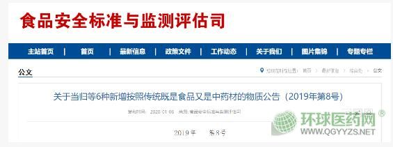 近日,國家衛(wèi)健委、國家市場監(jiān)管總局聯(lián)合發(fā)布《關于當歸等6種新增按照傳統(tǒng)既是食品優(yōu)勢中藥材的物質公告(2019年第8號)》。
