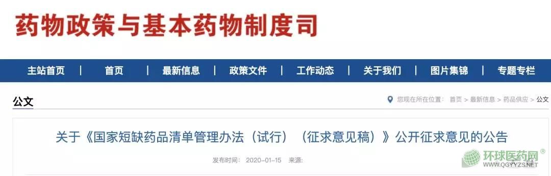 1月15日,國(guó)家衛(wèi)健委藥政司發(fā)布文件——關(guān)于《國(guó)家短缺藥品清單管理辦法(試行)(征求意見(jiàn)稿)》公開(kāi)征求意見(jiàn)的公告。