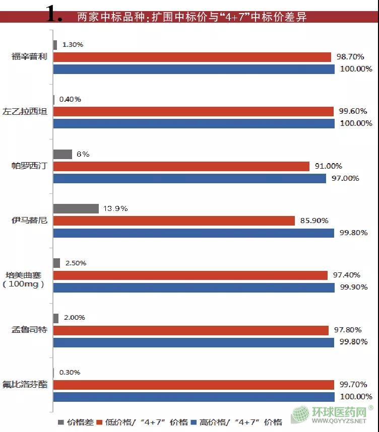 二是兩家中標(biāo)情況,如氟比洛芬酯、福辛普利、孟魯司特、帕羅西汀、培美曲塞(100mg)、伊馬替尼、左乙拉西坦等7種藥品有兩家中標(biāo)。