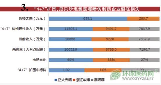 同理,厄貝沙坦氫氯噻嗪中標(biāo)企業(yè)分別為賽諾菲、浙江華海和正大天晴,原研藥報(bào)價(jià)最高,“4+7”中標(biāo)企業(yè)浙江華海次之,新中標(biāo)企業(yè)正大天晴價(jià)格最低,但兩家仿制藥企業(yè)可以選擇略低于“4+7”價(jià)格,比如低0.01元(1.09-0.01=1.08)。此時(shí),由于正大天晴之前市場(chǎng)占有率較高,可以獲得最大市場(chǎng)份額,可計(jì)算二者之間存在的價(jià)格差異。
