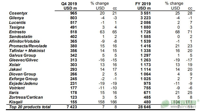 諾華2019年TOP20銷售品種