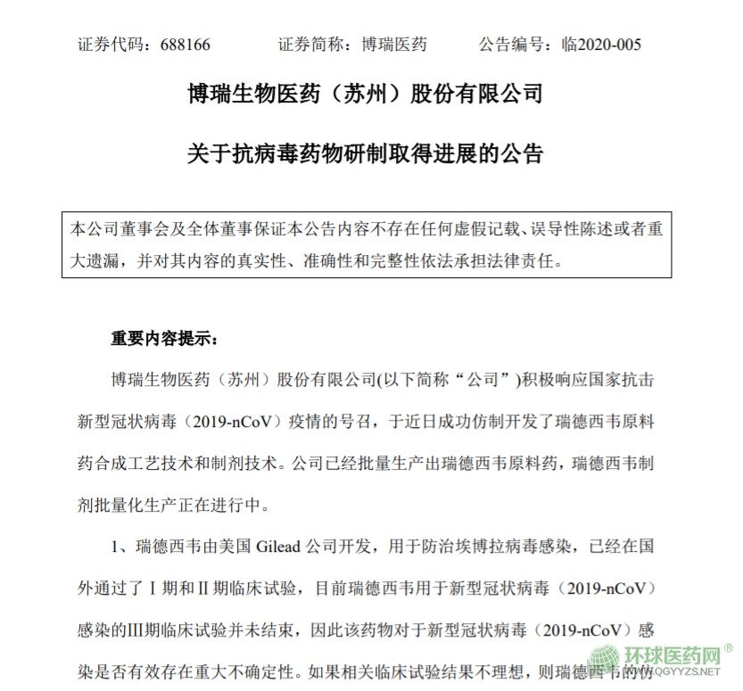 2月11日晚間,博瑞生物醫(yī)藥發(fā)布企業(yè)公告,稱積極響應國家抗擊新型冠狀病毒(2019-nCoV)疫情的號召,于近日成功仿制開發(fā)了瑞德西韋原料藥合成工藝技術(shù)和制劑技術(shù)。其公司已經(jīng)批量生產(chǎn)出瑞德西韋原料藥,瑞德西韋制劑批量化生產(chǎn)正在進行中。