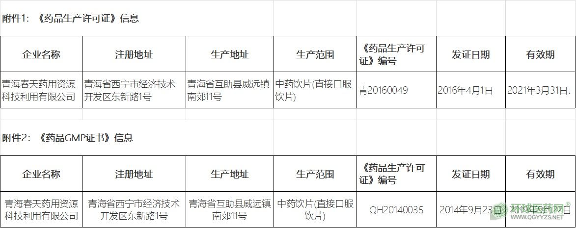 2020年1月19日,青海藥監(jiān)局網(wǎng)站消息,依據(jù)企業(yè)申請,發(fā)布《注銷青海春天藥用資源科技利用有限公司 《藥品生產(chǎn)許可證》《藥品GMP證書》的公告》。