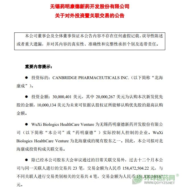 2月18日,藥明康德發(fā)布公告稱,該公司全資子企業(yè)藥明基金一期、GeneralAtlantic等8名投資人與CANBRIDGEPHARMACEUTICALSINC.(以下簡稱“北海康成”)及其他相關(guān)方簽署優(yōu)先股認購協(xié)議。