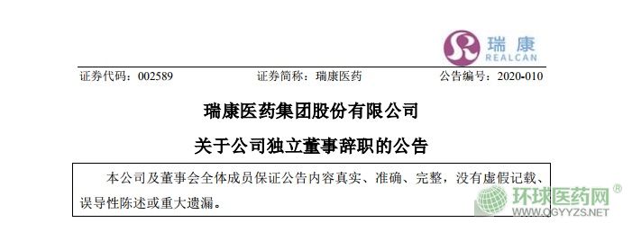 2月20日,瑞康醫(yī)藥發(fā)布公告稱,董事會(huì)于近日收到公司獨(dú)立董事權(quán)玉華女士的書面辭職報(bào)告,權(quán)玉華女士因個(gè)人原因申請(qǐng)辭去公司獨(dú)立董事及相關(guān)專門委員會(huì)職務(wù),辭職后其本人將不再擔(dān)任公司任何職務(wù)。