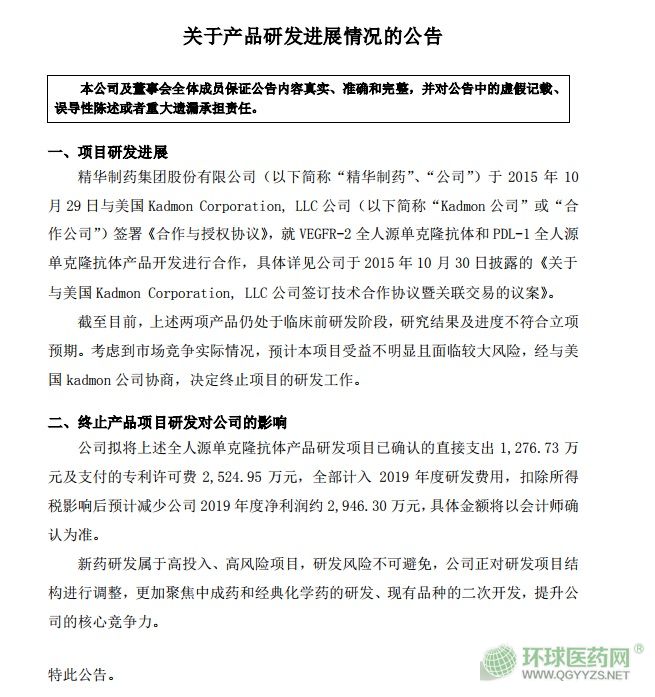 但截至目前,精華制藥稱,上述兩項產品仍處于臨床前研發(fā)階段,研究結果及進度不符合立項預期?紤]到市場競爭實際情況,預計項目受益不明顯且面臨較大風險,經與美國kadmon公司協(xié)商,決定終止項目的研發(fā)工作。