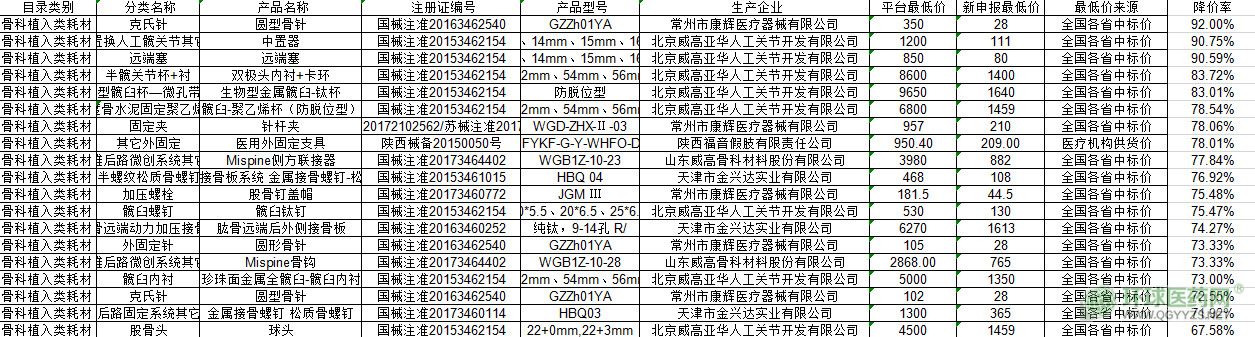 2019年8月9日,陜西省藥械集中采購(gòu)網(wǎng)就曾發(fā)布了《關(guān)于對(duì)骨科植入類醫(yī)用耗材動(dòng)態(tài)調(diào)整部分調(diào)整結(jié)果公示的通知》,公布了骨科耗材《限價(jià)掛網(wǎng)目錄》和《備選掛網(wǎng)目錄》產(chǎn)品價(jià)格調(diào)整結(jié)果,2306種全部降價(jià),降幅20%以上的達(dá)374種,降幅50%以上的達(dá)65種,最高降幅達(dá)92%。涉及美敦力、威高、創(chuàng)生、邦美多款骨科耗材產(chǎn)品。