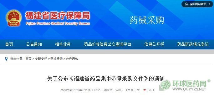 2020年2月26日,福建省醫(yī)保局發(fā)布《福建省藥品集中帶量采購文件》的通知,公布艾司奧美拉唑、莫西沙星(含莫西沙星氯化鈉)、亮丙瑞林、雷貝拉唑、還原型谷胱甘肽、雷貝拉唑、順阿曲庫銨、尼麥角林、丙泊酚中/長鏈脂肪乳、頭孢克洛、伏立康唑、腺苷蛋氨酸、哌拉西林舒巴坦、非布司他14個品種涉及22品規(guī)納入省級集中帶量采購。