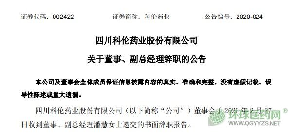 2月27日,科倫藥業(yè)發(fā)布公告稱,公司董事會(huì)于2020年2月27日收到董事、副總經(jīng)理潘慧女士遞交的書(shū)面辭職報(bào)告。