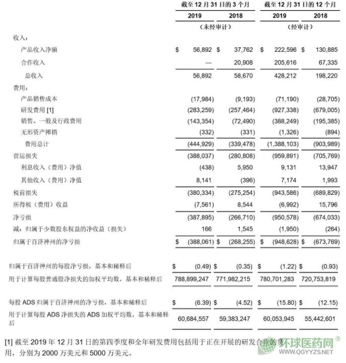 截至2019年12月31日的第四季度和全年的合作收入分別為零和2.0562億美元,相比較,2018年同期的合作收入分別為2091萬(wàn)美元和6743萬(wàn)美元。2019年全年收入包括與新基公司就終止百澤安®合作所獲得的1.5億美元。