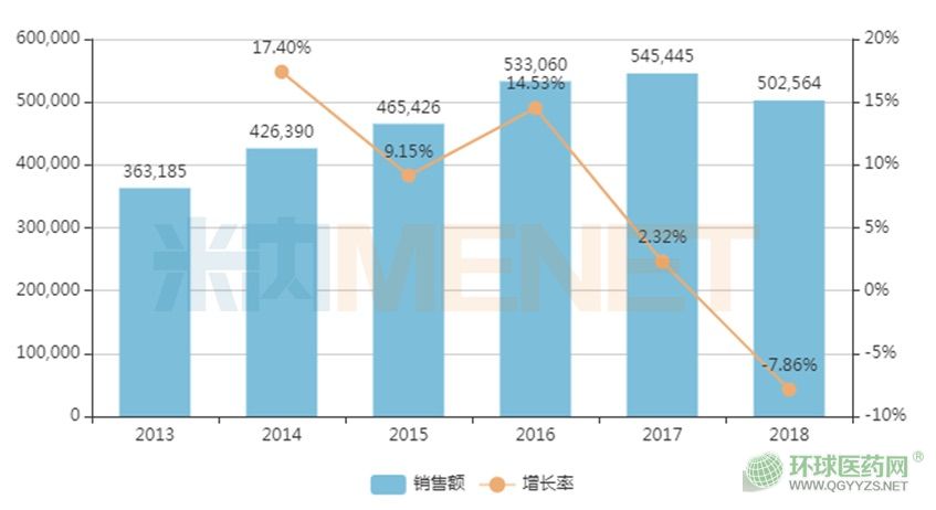 據(jù)米內(nèi)網(wǎng)數(shù)據(jù)顯示,在中國城市公立醫(yī)院、縣級公立醫(yī)院、城市社區(qū)中心及鄉(xiāng)鎮(zhèn)衛(wèi)生院(簡稱中國公立醫(yī)療機構(gòu))終端,依達拉奉在2016年的銷售額已突破50億元,最近幾年受到醫(yī)?刭M、重點監(jiān)控合理用藥等政策影響,銷售額又緩慢下滑的跡象,2018年保持在50.3億元左右。