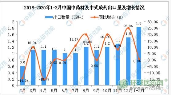 據(jù)中商產(chǎn)業(yè)研究院數(shù)據(jù)庫顯示,2020年1-2月中國中藥材及中式成藥出口量有所增長,2020年1-2月中國中藥材及中式成藥出口量為1.8萬噸,同比增長0.8%。
