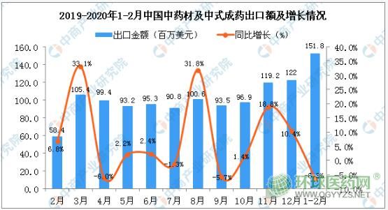 從金額方面來看,20120年1-2月中國中藥材及中式成藥出口金額為151.8百萬美元,同比下降6.3%。