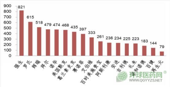 因為這些公司合計業(yè)務(wù)收入占全球藥品市場規(guī)模的比例超過1/3,因此與全球藥品市場主要用藥領(lǐng)域較為類似,抗腫瘤藥業(yè)務(wù)收入也是貢獻(xiàn)這些企業(yè)業(yè)務(wù)收入的重要領(lǐng)域,同時涉及該治療領(lǐng)域的企業(yè)也較多,達(dá)到15家,僅有百健和諾和諾德沒有該領(lǐng)域藥品帶來貢獻(xiàn)。2019年在腫瘤用藥領(lǐng)域業(yè)務(wù)收入超過百億美元的企業(yè)有羅氏、諾華、美國默克和強(qiáng)生四家,其中羅氏、諾華在200億美元以上。