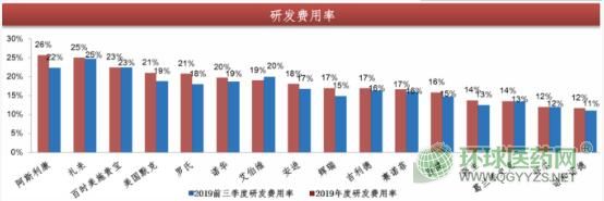 這些全球頭部藥企取得龐大市場規(guī)模是建立在不斷研發(fā)創(chuàng)新基礎(chǔ)上的,不僅研發(fā)水平較高,研發(fā)投入力度大。2019年17家核心藥企平均研發(fā)費(fèi)用率為20%,總體較前三季度提升3%。高研發(fā)投入是跨國藥企長期穩(wěn)健增長的核心因素。其中占比最高的前三企業(yè)是阿斯利康、禮來和百時美施貴寶。