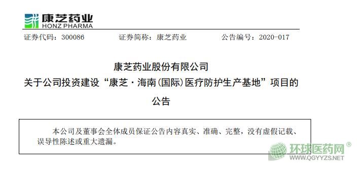 3月17日,康芝藥業(yè)公告,公司擬在海南?诂F(xiàn)有的場地基礎上,投資建設“康芝·海南(國際)醫(yī)療防護生產基地”項目,項目總投資擬為3.70億元。