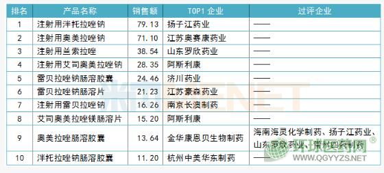 2018年中國公立醫(yī)療機構(gòu)終端治療消化性潰瘍藥銷售額近400億元,同比增長2.33%。從產(chǎn)品TOP10來看,銷售額占治療消化性潰瘍藥的比例超過80%,市場集中度較高,其中,注射用泮托拉唑鈉和注射用奧美拉唑鈉銷售額均超過70億元,而這兩個產(chǎn)品的領(lǐng)頭企業(yè)分別是揚子江藥業(yè)和江蘇奧賽康藥業(yè)。
