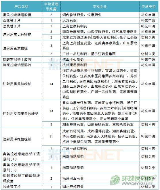 目前,正在審評的治療消化性潰瘍藥一致性評價申請有26個產(chǎn)品,涉及近90個受理號。值得注意的是,注射用奧美拉唑鈉、注射用艾司奧美拉唑鈉、注射用泮托拉唑鈉3個注射劑最為“火爆”,申報受理號均超過10個,涉及揚子江藥業(yè)、江蘇奧賽康藥業(yè)、江蘇正大豐海制藥、山東羅欣藥業(yè)、正大天晴藥業(yè)集團、宜昌人福藥業(yè)等企業(yè)。