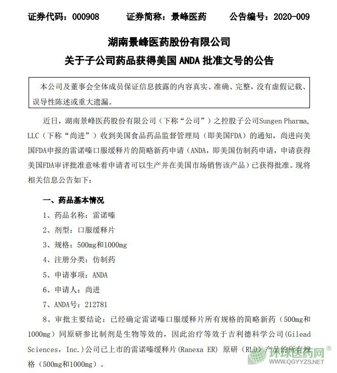 3月24日,景峰醫(yī)藥發(fā)布公告稱,近日控股子公司SungenPharma,LLC(尚進(jìn))收到美國FDA的通知,尚進(jìn)向美國FDA申報(bào)的雷諾嗪口服緩釋片的簡略新藥申請(ANDA,即美國仿制藥申請,申請獲得美國FDA審評批準(zhǔn)意味著申請者可以生產(chǎn)并在美國市場銷售該產(chǎn)品)已獲得批準(zhǔn)。
