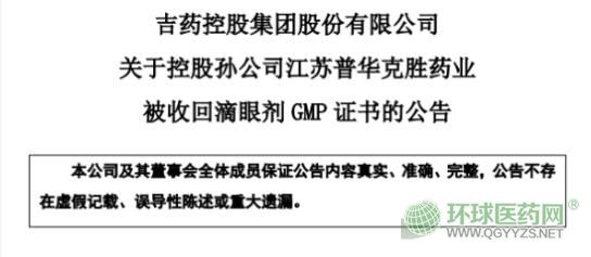 日前,吉藥控股發(fā)布公告稱(chēng),公司控股孫公司克勝藥業(yè)被江蘇省藥監(jiān)局責(zé)令收回滴眼劑GMP證書(shū),原因是克勝藥業(yè)2017年采購(gòu)原料羥芐唑違規(guī)、不良反應(yīng)直報(bào)等八項(xiàng)問(wèn)題和缺陷違反藥品管理法、嚴(yán)重違反藥品GMP相關(guān)規(guī)定?藙偎帢I(yè)于2019年12月9日被收回滴眼劑GMP證書(shū),而這將造成滴眼劑停產(chǎn)。