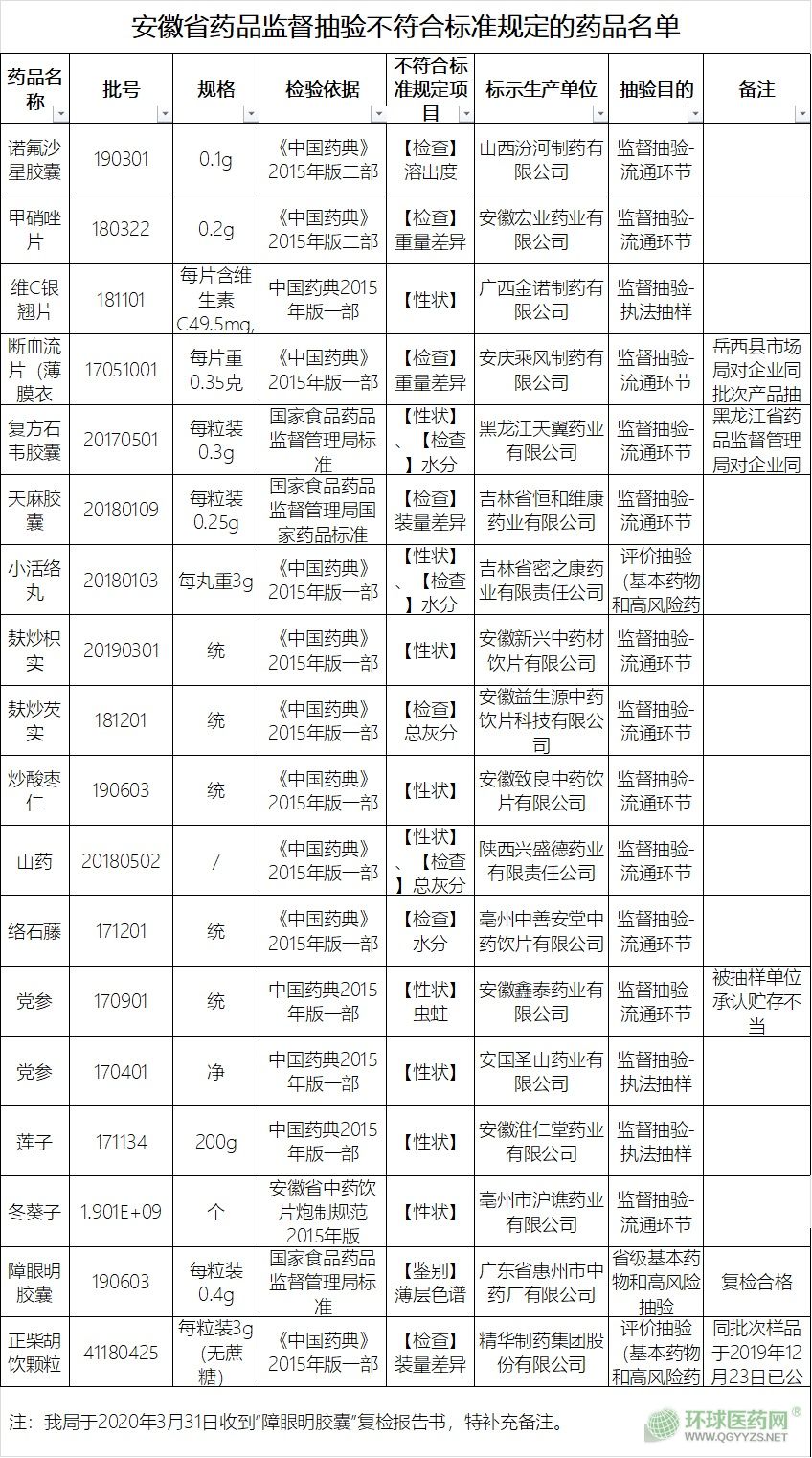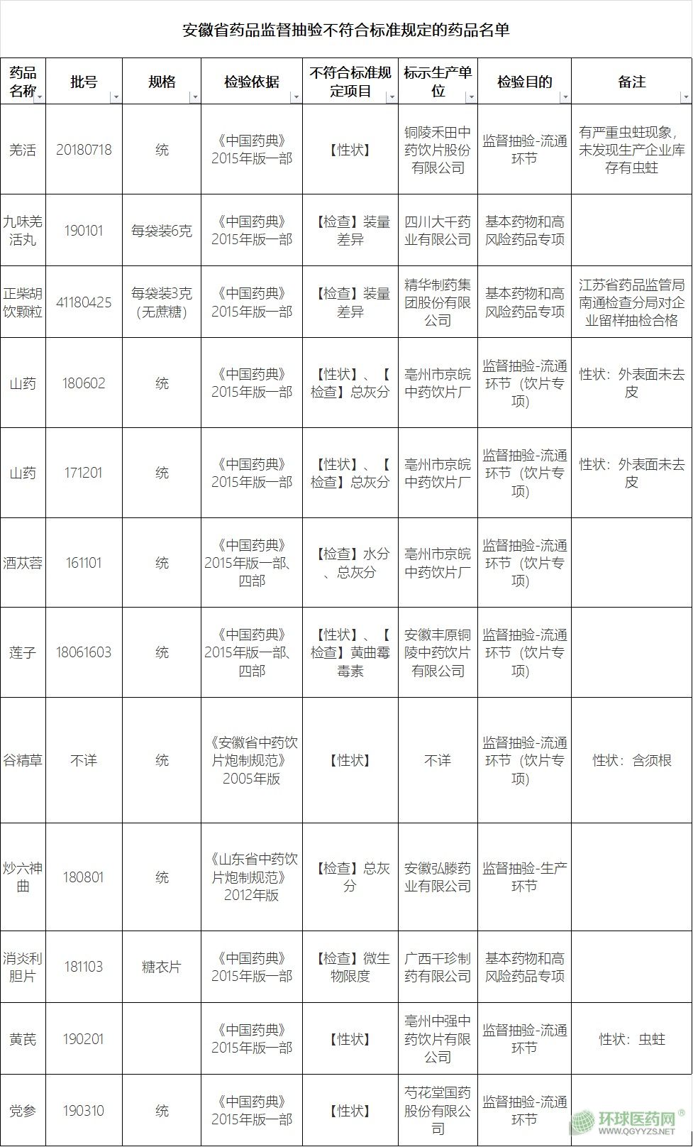 根據(jù)安徽省藥品抽驗計劃,全省各級市場監(jiān)督管理部門和藥品檢驗機(jī)構(gòu)對本行政區(qū)域藥品生產(chǎn)、經(jīng)營企業(yè)和使用單位的藥品質(zhì)量進(jìn)行了監(jiān)督抽驗。本期經(jīng)抽驗并核查確認(rèn),共11個品種12批次藥品不符合標(biāo)準(zhǔn)規(guī)定,不符合規(guī)定項目包括【性狀】、【檢查】裝量差異、總灰分、水分、黃曲霉毒素、微生物限度、【含量測定】,詳細(xì)見附件。對上述抽驗結(jié)果不符合標(biāo)準(zhǔn)規(guī)定的藥品及相關(guān)單位,各級市場監(jiān)督管理部門正在依法進(jìn)行查處。