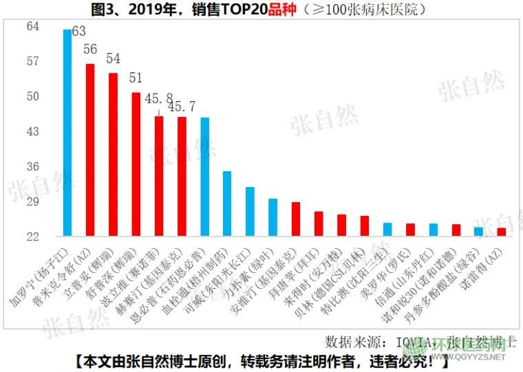 按IQVIA數(shù)據(jù)統(tǒng)計(jì),2019年,在≥100張病床醫(yī)院銷售額TOP 20品種中,外企占了2/3(12個(gè)),除銷售額最大的揚(yáng)子江的加羅寧(63.09億元)外,后面5個(gè)品種全部來自外企,分別是普米克令舒(AZ)56.2億元、立普妥(輝瑞)54.5億元、舒普深(輝瑞)50.5億元、波立維(賽諾菲)45.8億元和赫賽汀(基因泰克)45.7億元。其中,位居第3和第4位的立普妥和舒普深都來自輝瑞,僅這兩個(gè)品種就為該公司貢獻(xiàn)了105億元,足見原在華外企“一哥”的實(shí)力。此外,AZ和基因泰克也各有2個(gè)品種入圍TOP 20。(圖3)