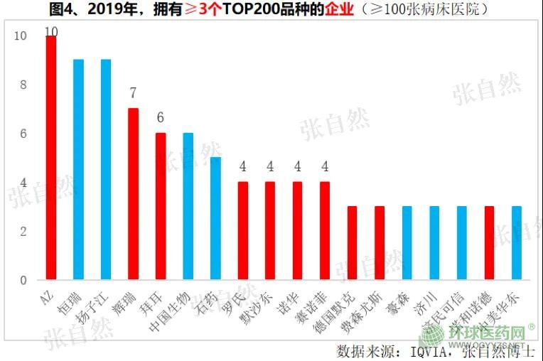 而擁有≥3個(gè)TOP 200品種的本土企業(yè)只有8個(gè),僅為外企的2/3,其中還包括濟(jì)川、濟(jì)民可信兩家中藥企業(yè)和含有部分中藥品種的的中美華東和揚(yáng)子江(圖4)?梢,在≥100張病床醫(yī)院市場(chǎng),外企在西藥領(lǐng)域的優(yōu)勢(shì)暫時(shí)難以被本土企業(yè)取代。