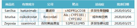 根據(jù)美國FDA官網(wǎng)公布的消息,2020年3月FDA批準(zhǔn)3款創(chuàng)新藥物,分別是賽諾菲公司的Sarclisa,Recordati公司的Isturisa,以及百時美施貴寶公司的Zeposia。2020年一季度,美國FDA共批準(zhǔn)11款創(chuàng)新藥,包括8款新分子實體和3款生物藥。
