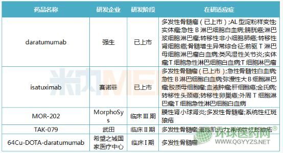 Sarclisa的活性成分isatuximab,是一種靶向漿細胞表面CD38受體的單克隆抗體,可誘導(dǎo)腫瘤細胞程序性死亡/凋亡和免疫調(diào)節(jié)活性。作為治療腫瘤的潛在靶點,在isatuximab之前,強生的CD38單抗達雷妥尤單抗(daratumumab)已在2015年上市,并于2019年7月在中國獲批上市。目前MorphoSys、武田等均有CD38單抗在研。