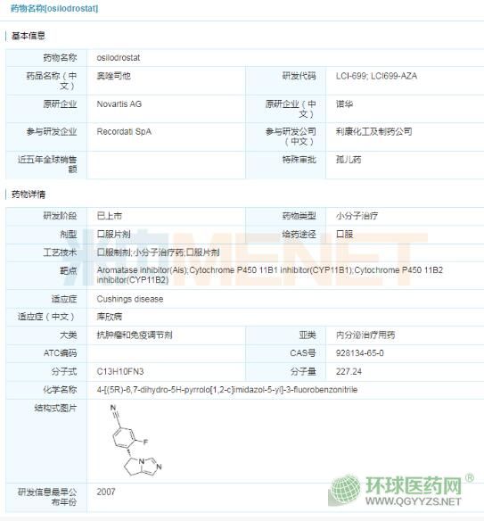 2020年3月6日,Recordati公司宣布,F(xiàn)DA批準(zhǔn)了其新藥Isturisa(osilodrostat)上市,用于治療無法接受腦垂體手術(shù),或者接受手術(shù)后癥狀依然存在的庫欣病成年患者。Isturisa由諾華開發(fā),2019年中旬,Recordati公司從諾華公司收購了Isturisa的全球開發(fā)和推廣權(quán)益。2020年1月9日,Isturisa(osilodrostat phosphate)已在歐盟上市,用于治療成人內(nèi)源性庫欣綜合征。美國FDA和歐盟EMA均賦予Isturisa孤兒藥資格認(rèn)定。