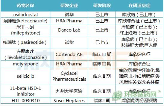 此前,庫欣病的治療藥物主要包括3類:作用于垂體的神經(jīng)遞質(zhì)類藥物如帕瑞肽、作用于腎上腺抑制皮質(zhì)醇分泌的藥物如酮康唑,及糖皮質(zhì)激素受體拮抗劑如米非司酮。同時,還有一些企業(yè)布局庫欣病/庫欣綜合征治療藥物,例如Cortendo AB公司和HRA制藥公司的治療庫欣綜合征藥物已進入臨床III期階段。
