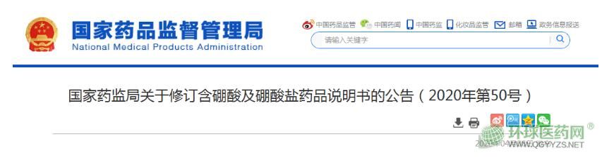國家藥監(jiān)局發(fā)布關于修訂含硼酸及硼酸鹽藥品說明書的公告(2020年第50號)。