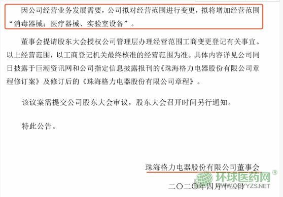 4月13日,格力電器發(fā)布公告,因公司經(jīng)營業(yè)務(wù)發(fā)展需要,公司擬對經(jīng)營范圍進(jìn)行變更,擬將增加經(jīng)營范圍 “消毒器械 ; 醫(yī)療器械、實驗室設(shè)備”。