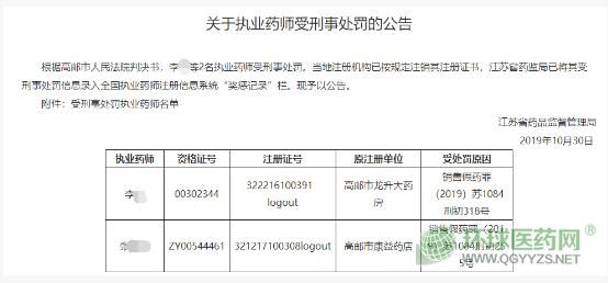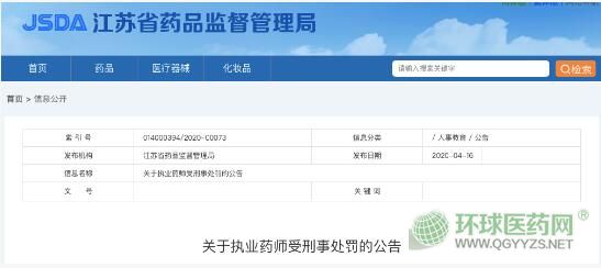近日,江蘇省藥監(jiān)局發(fā)布了《關(guān)于執(zhí)業(yè)藥師受刑事處罰的公告》。