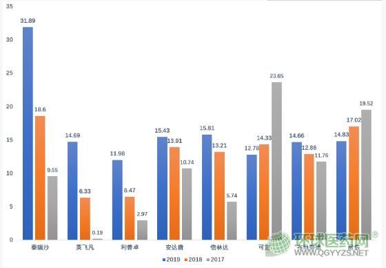 2017~2019年阿斯利康部分藥物全球銷售情況(單位:億美元)