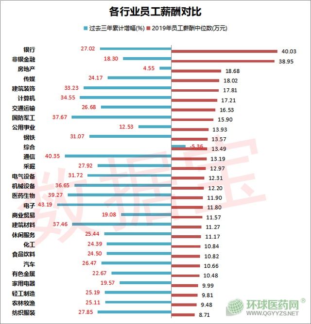 據(jù)統(tǒng)計,與2016年相比,有10個行業(yè)過去三年累計增幅超過了30%。值得一提的是,醫(yī)藥生物過去三年累計增幅超過了39%。在今年疫情期間,抗疫相關的醫(yī)藥公司發(fā)揮了重要作用,相信醫(yī)藥行業(yè)的薪酬在今年或還會有較大的提升空間。